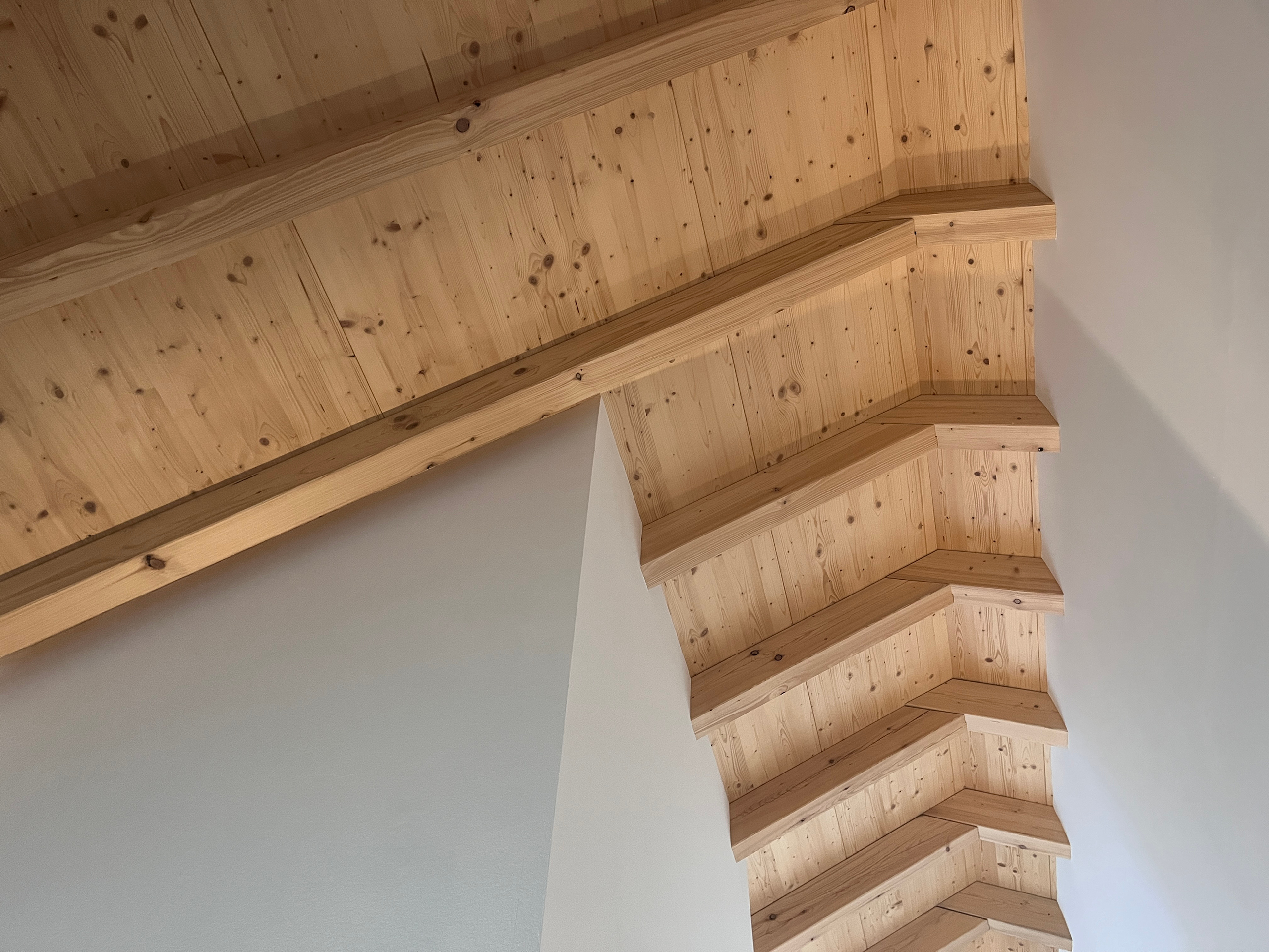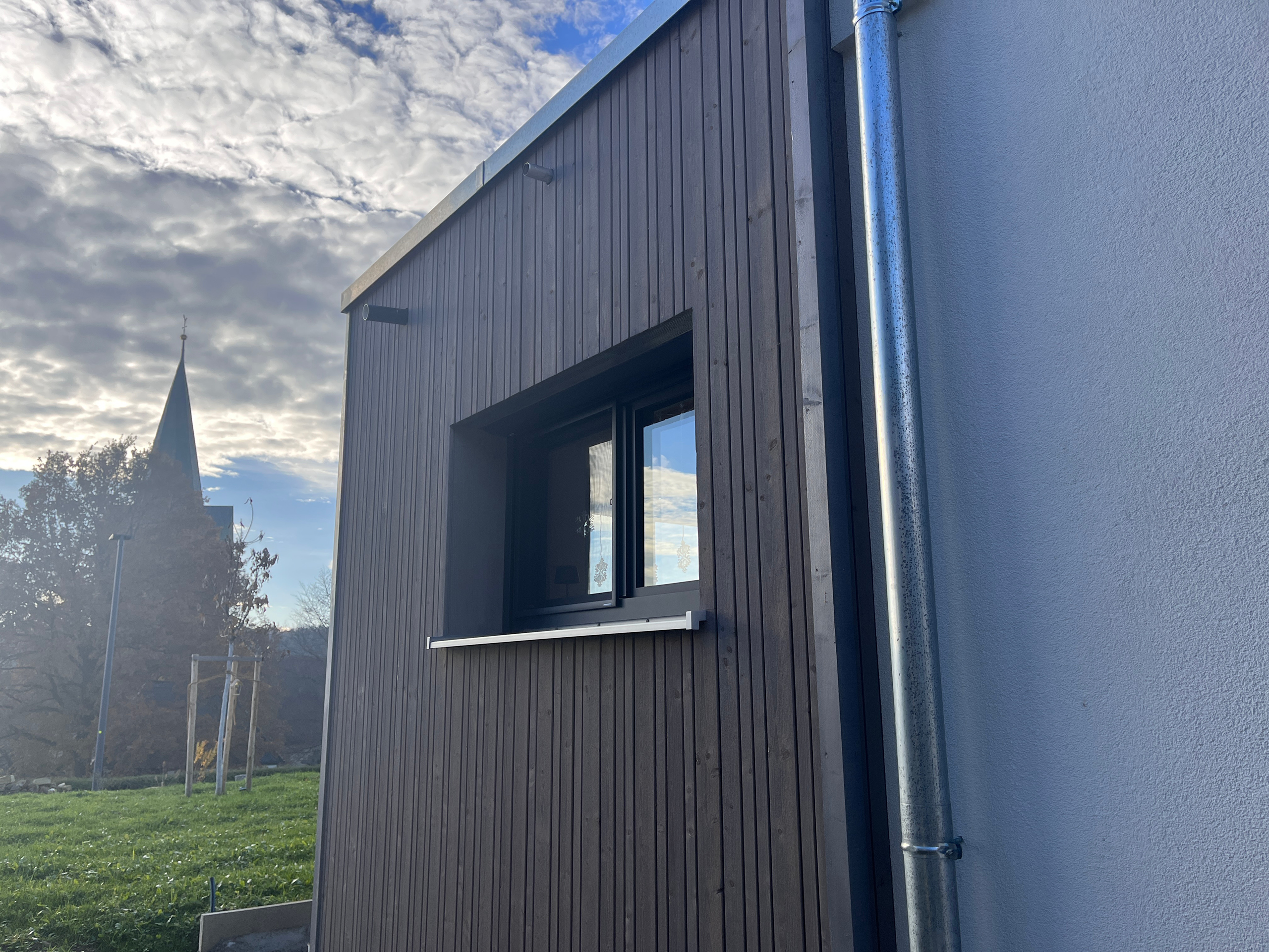 Das Grundstück mit Hanglage bot die Chance, ein Haus zu entwickeln, das seine Umgebung aktiv in die Architektur einbindet. Entstanden ist ein Wohnhaus, das von der Straße aus zurückhaltend wirkt und sich zum Garten großzügig öffnet. Die Gliederung der Baukörper passt sich dem natürlichen Gelände an: oben schließt der Carport mit Geräteraum an die Straße an, darunter liegen Lagerflächen und eine Werkstatt für den Garten. So wird die Hanglage funktional genutzt und bietet gleichzeitig eine klare Abschirmung zur Straßenseite. Haustechnik und Nebenräume sind funktional im Hang untergebracht, wodurch die Hauptbereiche frei und großzügig bleiben. Das Wohnen konzentriert sich auf das untere Geschoss mit direktem Zugang zum Garten. Der offene Bereich für Kochen, Essen und Wohnen ist großzügig verglast und schafft eine enge Verbindung zwischen Innen- und Außenraum. Auf derselben Ebene befindet sich auch ein Gästezimmer, das Privatsphäre und Nähe zugleich ermöglicht. Die Kinderzimmer im Obergeschoss bieten weite Ausblicke ins Dorf, eines davon mit zusätzlicher Zwischenebene