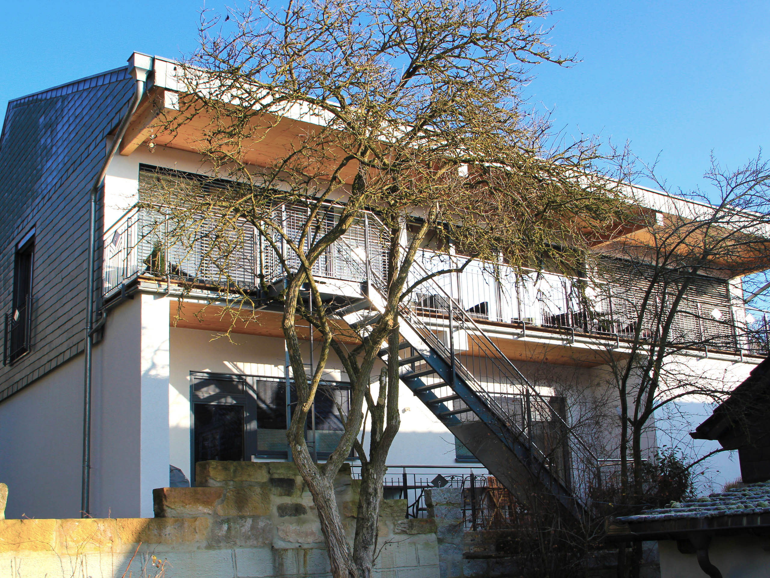 Dieses Gebäude wurde ursprünglich als Werkstatt mit Büro geplant, jedoch später als Einfamilienhaus genutzt. Der Baukörper erhält durch das asymmetrische Dach eine markante Form, dessen Auskragung gleichzeitig die Terrasse im Obergeschoss überdacht.