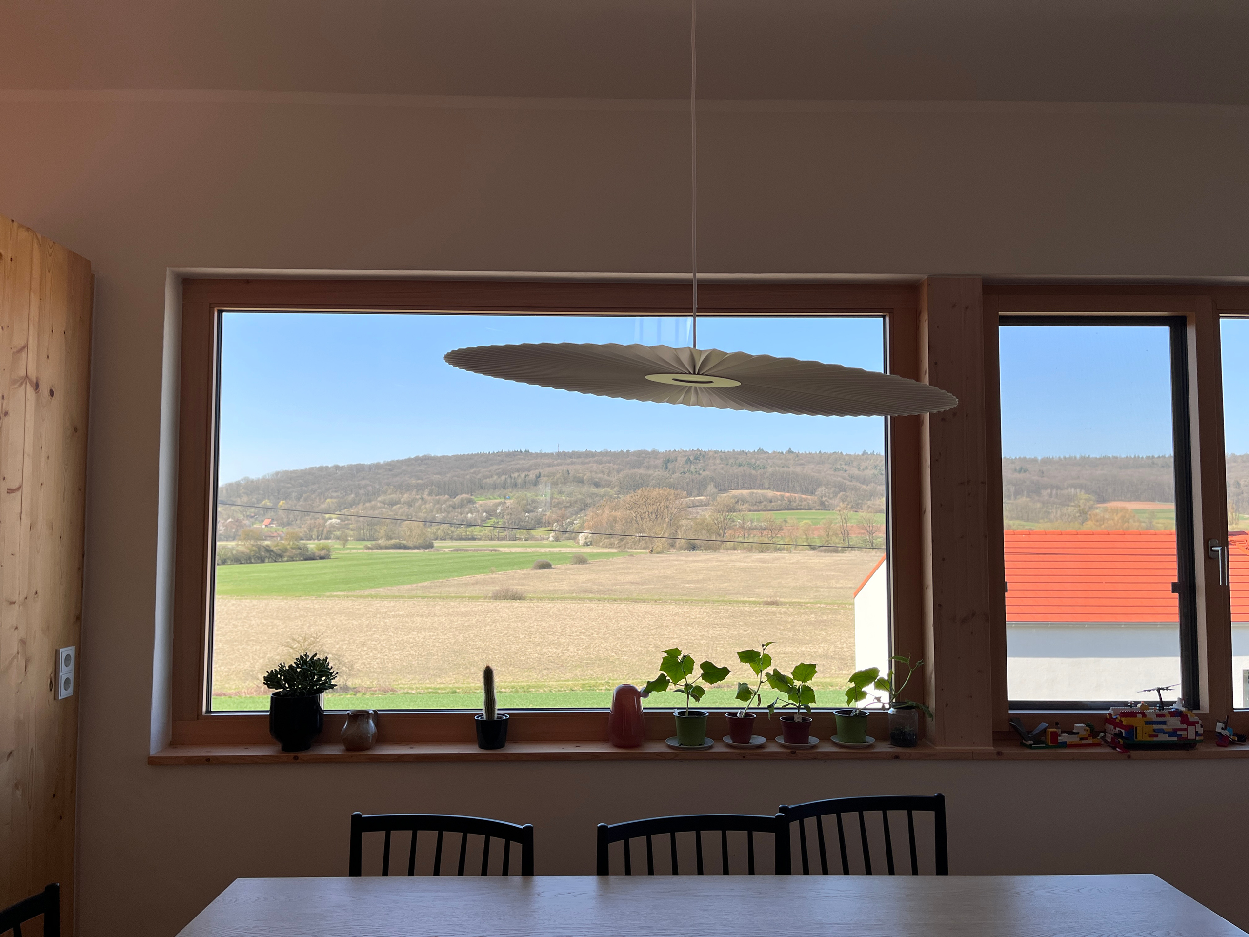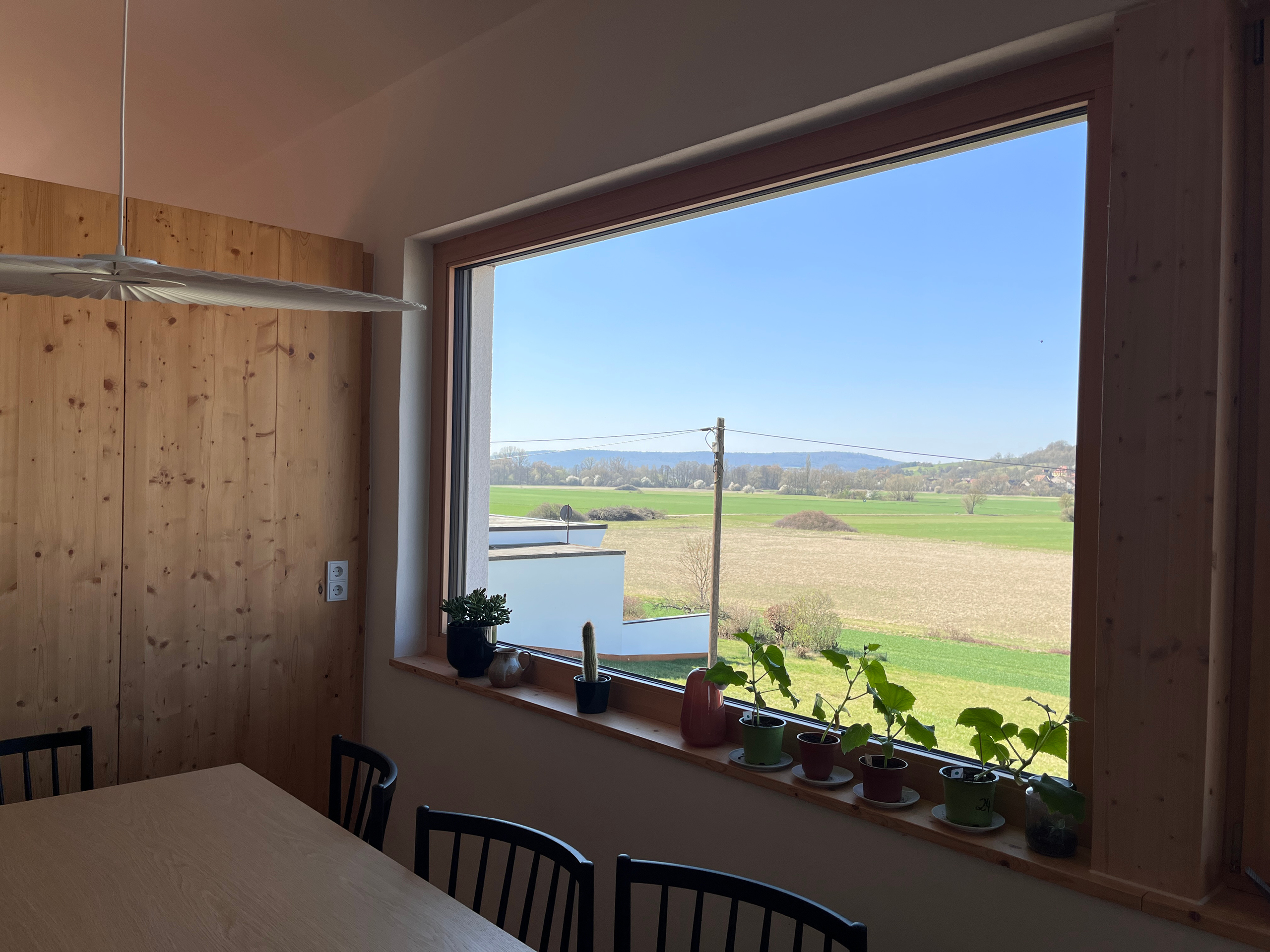Die neue Wohneinheit überzeugt durch einen offenen Koch-, Ess- und Wohnbereich, der über eine innenliegende Treppe direkt in das Dachgeschoss führt. Großzügige Holz-Alu-Fensterelemente sorgen für viel Tageslicht und schaffen eine natürliche Verbindung zum Außenraum. Ein direkt angeschlossener Balkon mit Treppe in den Garten erweitert den Wohnraum ins Grüne. Für das gesunde Wohnklima wurden für die Innenwände Lehmputz eingesetzt.