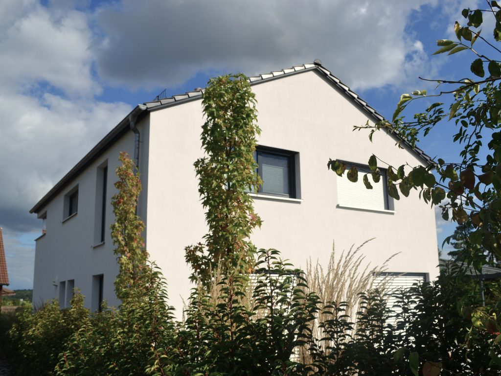 Die Baufamilie wünschte sich ein Haus, das modernen, schlichten Stil mit einem klaren Bezug zum dörflichen Kontext verbindet. Entstanden ist ein kompaktes, zeitgemäßes Wohnhaus mit einem flach geneigten Satteldach und einem kompakten Baukörper. So fügt sich das Gebäude harmonisch in seine Umgebung ein und bewahrt dennoch einen eigenständigen Charakter. Innen dominiert ein offenes, modernes Raumkonzept mit großzügigem Koch-Ess- und Wohnbereich, ergänzt durch einen Kamin als zentrales Element. Großzügige Fenster sorgen für viel Licht und Ausblicke, ohne die ruhige Gesamterscheinung zu stören. Nebenräume orientieren sich bewusst zur Straßenseite und schirmen den Wohnbereich ab. Der Elternbereich verfügt über ein eigenes Badezimmer, wodurch ein komfortabler Rückzugsort entsteht. Garage und überdachter Eingang bilden eine funktionale Ergänzung, die das Ensemble abrundet.